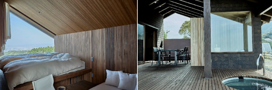 洞窟のような気積と深さを持った外空間であるアウトドア・リビングが象徴的な客室です。囲われた安心感や深さによる陰影が光を視覚化し、時間の移ろいを感じる自然の豊かさの体験を空間化しています。