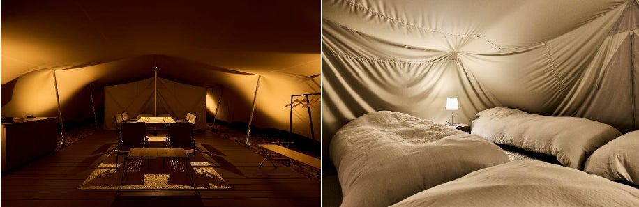 スノーピークがYAKEI SUITEのために開発した特別仕様のテント「LAND(ランド) CAVE(ケイヴ)」。キャンプ体験に近づけることを考えて設計されたテントでは、幕一枚越しに自然を感じる贅沢さを味わうことができます。