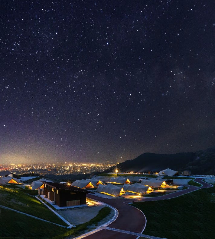 アウトドア・リビングでは、プライベートサウナで整い、大切な人とのお食事を愉しむことが出来ます。また、寝室の大きな窓ガラスから見える夜景を眺めながら眠りにつくことが出来るのもコテージの特徴です。