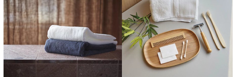 タオル、パジャマには、「最大限の安全と最小限の環境負荷」を企業理念にオーガニックコットンタオルの製造を行っている「IKEUCHI ORGANIC(イケウチオーガニック)」を採用。その他アメニティ類についてもSDGsの観点からリサイクル可能な製品や竹製素材等環境にやさしい素材を使用した製品を積極的に採用しています。