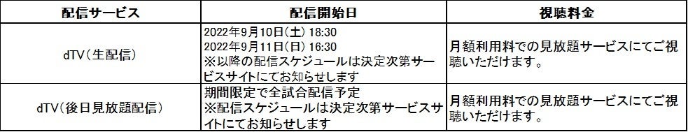 なお、開幕の2022年9月10日(土)と9月11日(日)の各第2試合目はdTVでも生配信します。