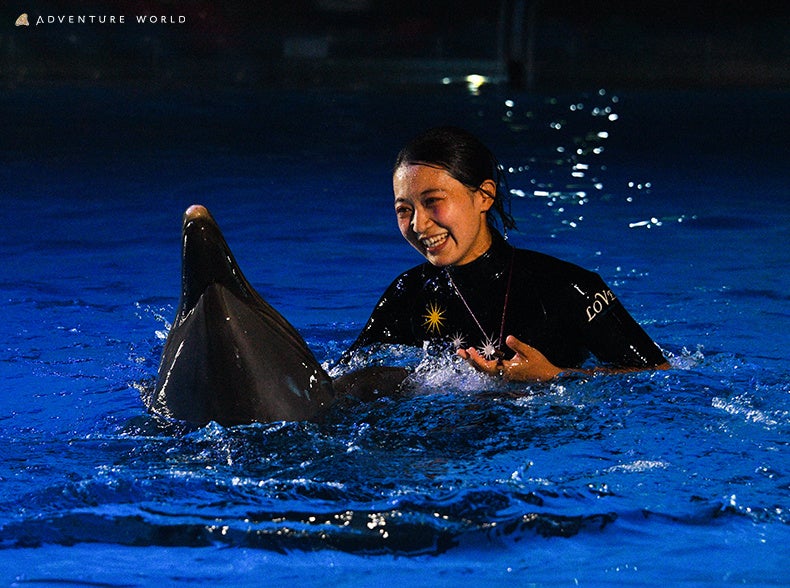 光と音楽に包まれた水のステージ「ビッグオーシャン」で、心が結ばれたイルカ・クジラ12頭とトレーナーが繰り広げる「愛」のパフォーマンス