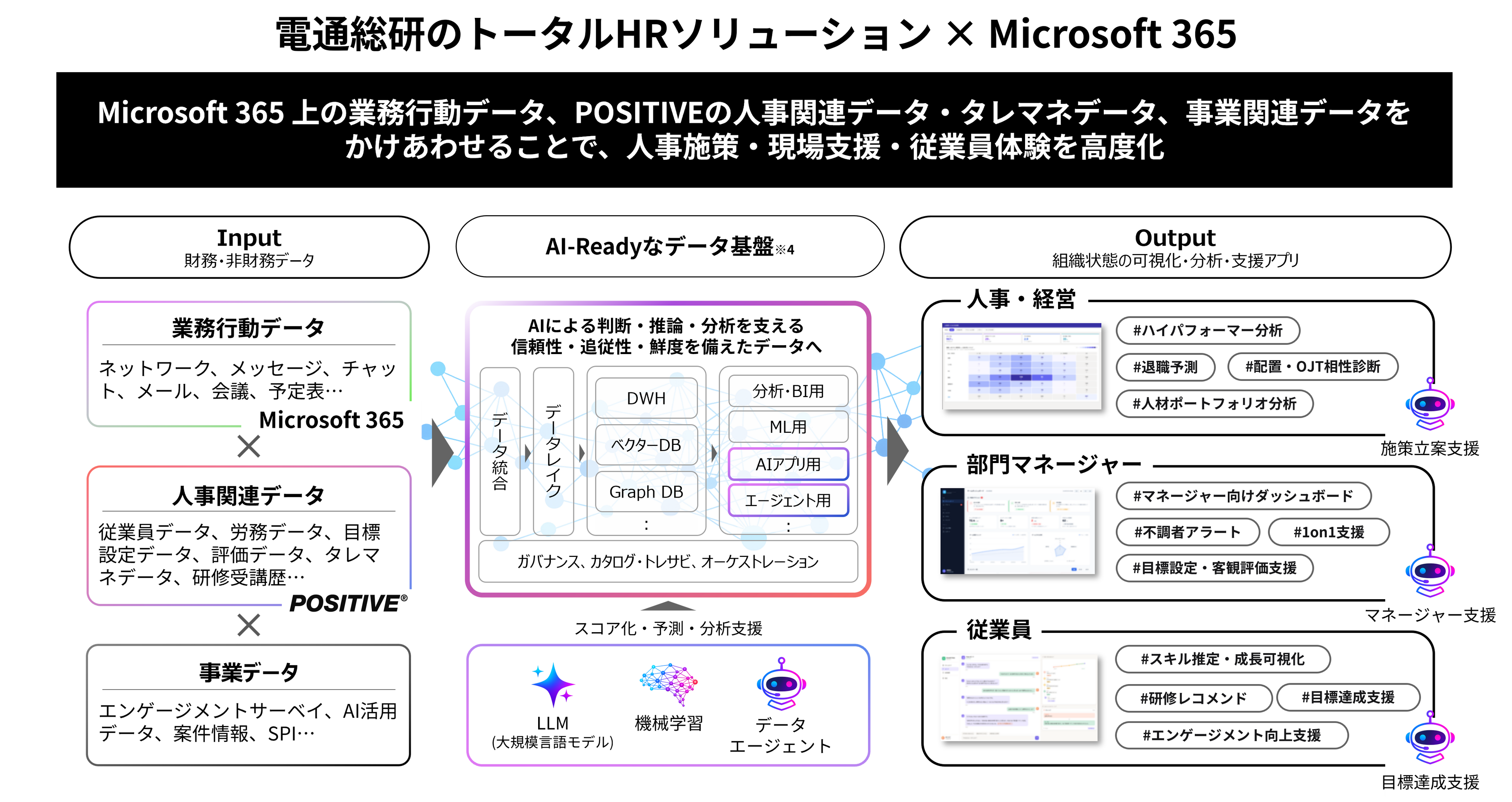 本ソリューションを起点に、全社人事の領域にとどまらず、事業部門・現場部門が抱える組織運営、人材配置、人材育成といった固有の課題にまで踏み込み、その整理から具体的な施策の検討までを伴走型で支援します。さらに、従来の人事データを中心としたタレントマネジメントの枠を超え、組織内のコラボレーションデータ(会議参加状況、コミュニケーション頻度等のメタデータ)※2を組み合わせ、AI-Ready※3なデータ基盤を中核に構築することで、組織・部門・個人の意思決定を支える実践的なインサイトを提供するとともに、タレントマネジメント・組織マネジメントの高度化、従業員エクスペリエンスの向上を実現します。