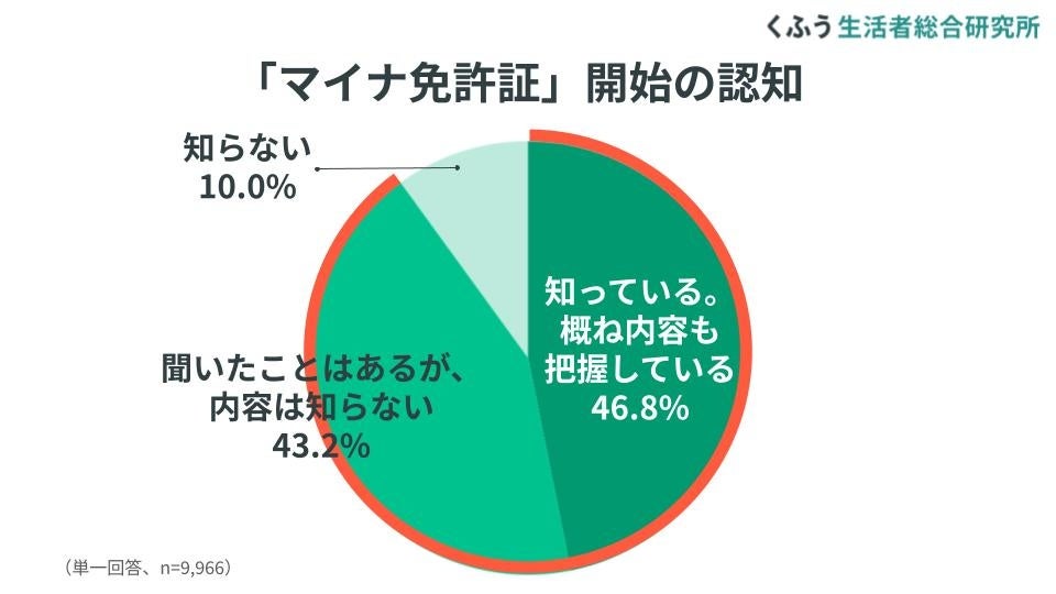 2025年3月24日に「マイナンバーカード」と「運転免許証」及び「運転経歴証明書」の一体化が開始されます。「マイナ免許証」の開始と、その開始時期や保有形態、「マイナ免許証」を保有するメリットなどの内容を知っているかをたずねたところ、「知っている。概ね内容も把握している」(46.8%)と回答した人が最も多く、僅差で「聞いたことはあるが、内容は知らない」(43.2%)が続き、9割が認知しているという結果となりました。