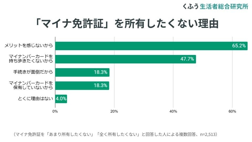 一方、マイナ免許証を「あまり所有したくない」「全く所有したくない」人の理由は「メリットを感じないから」(65.2%)が最多となりました。
