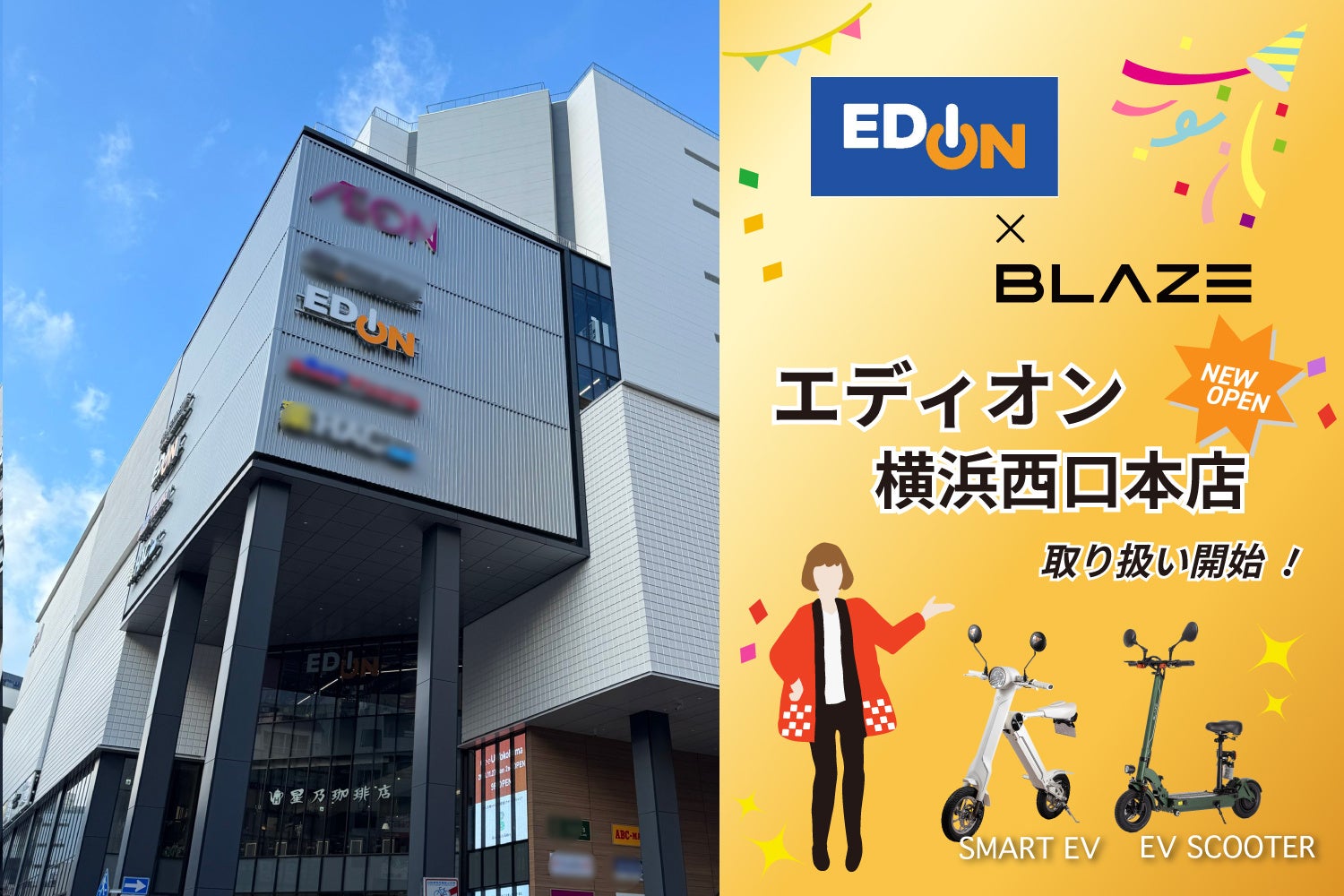 電動モビリティメーカーの株式会社ブレイズ(愛知県名古屋市、代表取締役:市川秀幸、以下ブレイズ)は、株式会社エディオン(大阪府大阪市、代表者:久保允誉、以下エディオン)が全国展開する店舗に先んじて「横浜西口本店」において、電動バイク「スマートEV」および「EVスクーター」の販売を開始いたしました。