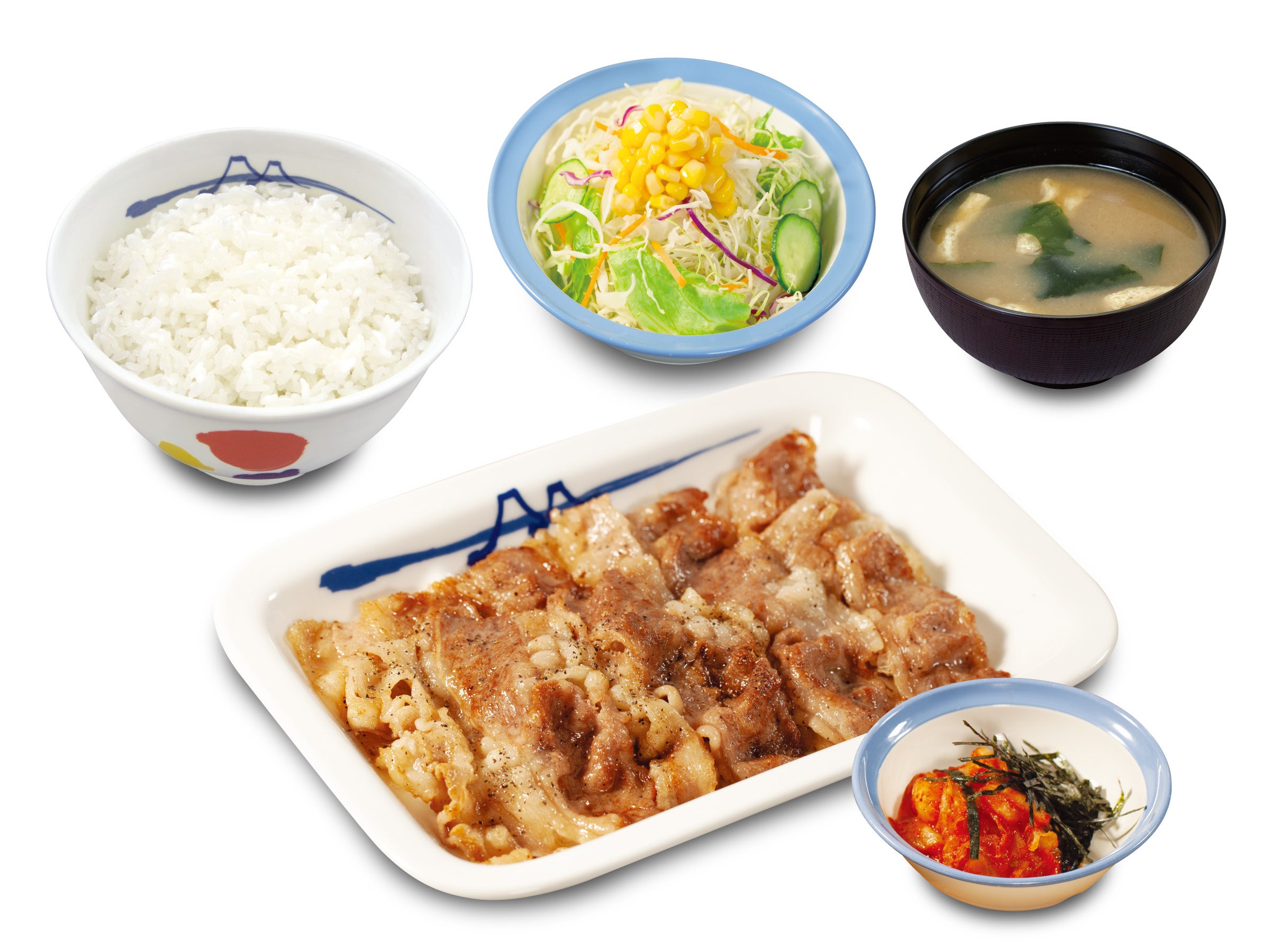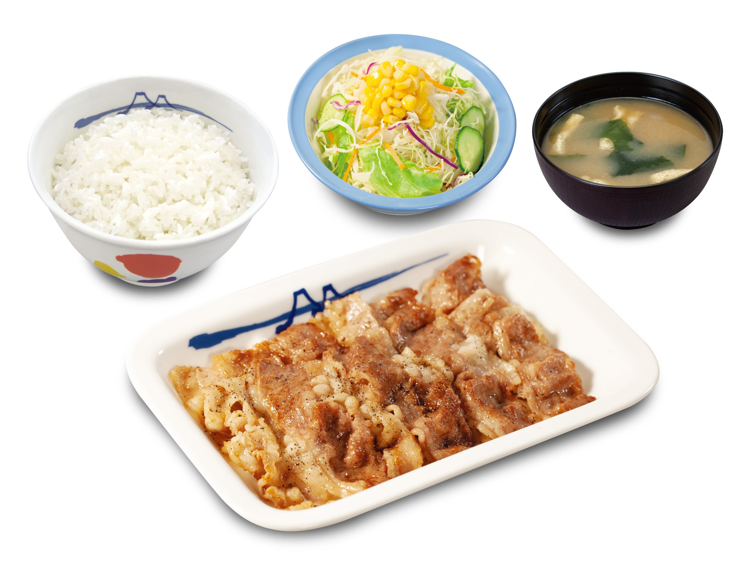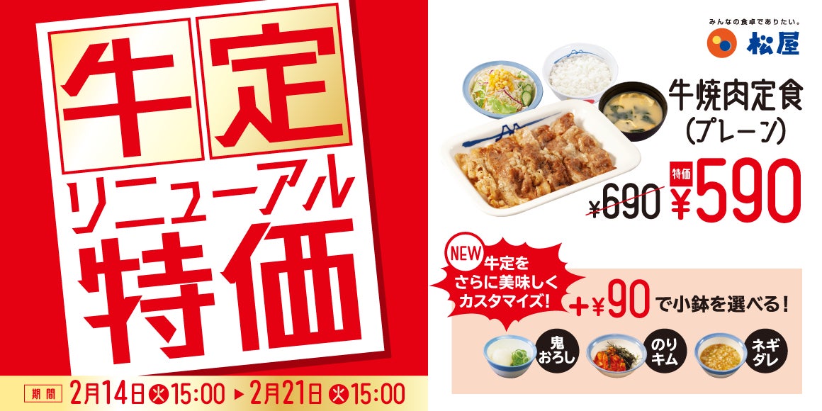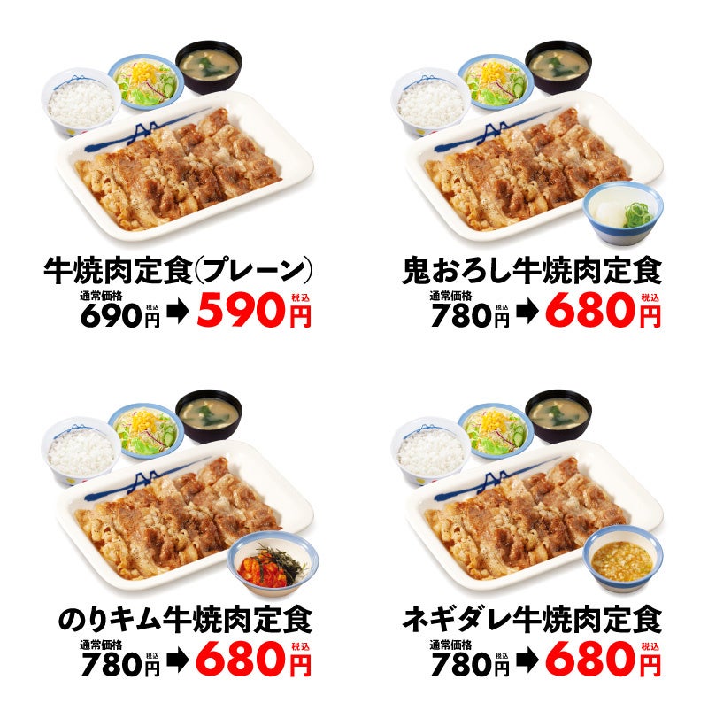 | 商品名 ☆牛焼肉定食 【2/14午後3時 ~ 2/21午後3時:お試し価格販売時】 牛焼肉定食(プレーン)※大根おろし抜き、青ネギ抜き 690円 → 590円 鬼おろし牛焼肉定食 780円 → 680円 のりキム牛焼肉定食 780円 → 680円 ネギダレ牛焼肉定食 780円 → 680円 【2/21午後3時~:お試し価格終了後】 牛焼肉定食(プレーン)※大根おろし抜き、青ネギ抜き 690円 鬼おろし牛焼肉定食 780円 のりキム牛焼肉定食 780円 ネギダレ牛焼肉定食 780円 ☆豚焼肉定食 ※2/14午後3時~販売価格 豚焼肉定食(プレーン)※大根おろし抜き、青ネギ抜き 650円 鬼おろし豚焼肉定食 740円 のりキム豚焼肉定食 740円 ネギダレ豚焼肉定食 740円 ※お持ち帰りいただけます。お持ち帰りにみそ汁は付きません。 お持ち帰りの場合、みそ汁は別途60円でお求めいただけます。 ※税込み価格です。 ※現在販売中の牛焼肉定食、豚焼肉定食、豚生姜定食は、2/14(火)午後3時をもって販売終了致します。 ※2/14(火)午後3時新発売の牛焼肉定食4種は、2/21(火)午後3時より通常価格での販売となります。 発売日 2023年2月14日(火)午後3時 ~ 対象店舗 一部店舗を除く全国の松屋 |