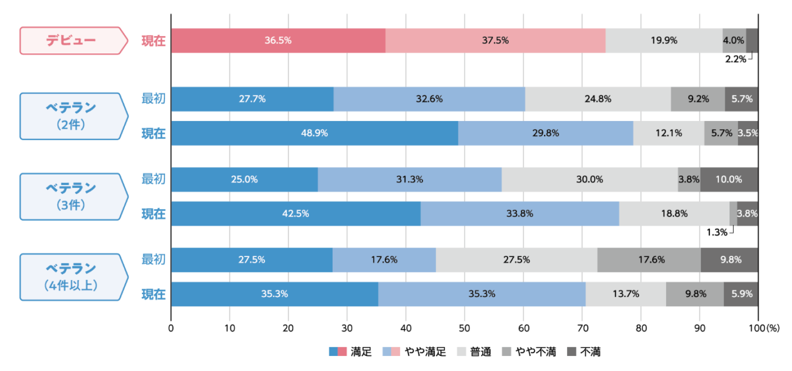 住まい探しベテランの物件満足度は、最初に一人暮らしをした物件と比較すると、現在の物件に対する満足度が全体的に高いことが分かりました。住まい探しデビューの物件満足度は、36.5%と3割を超えていました。