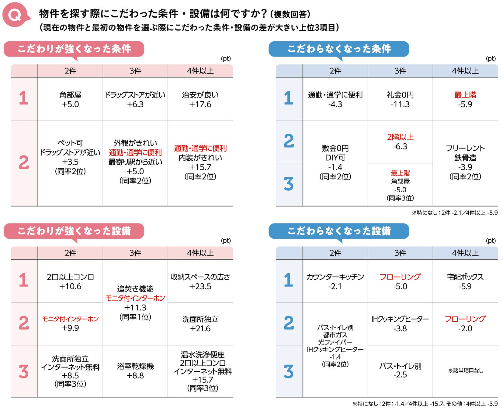 住まい探しベテランが最初の物件と現在の物件を比較して、物件を選ぶ際にこだわりが強くなった条件をみると、経験物件数3件・4件以上は「通勤・通学に便利」が上位に入りました。一方、こだわらなくなった条件では「2階以上」「最上階」が上位に入っており、引越しの回数を重ねるごとに階数に対するこだわりが薄まっているようです。