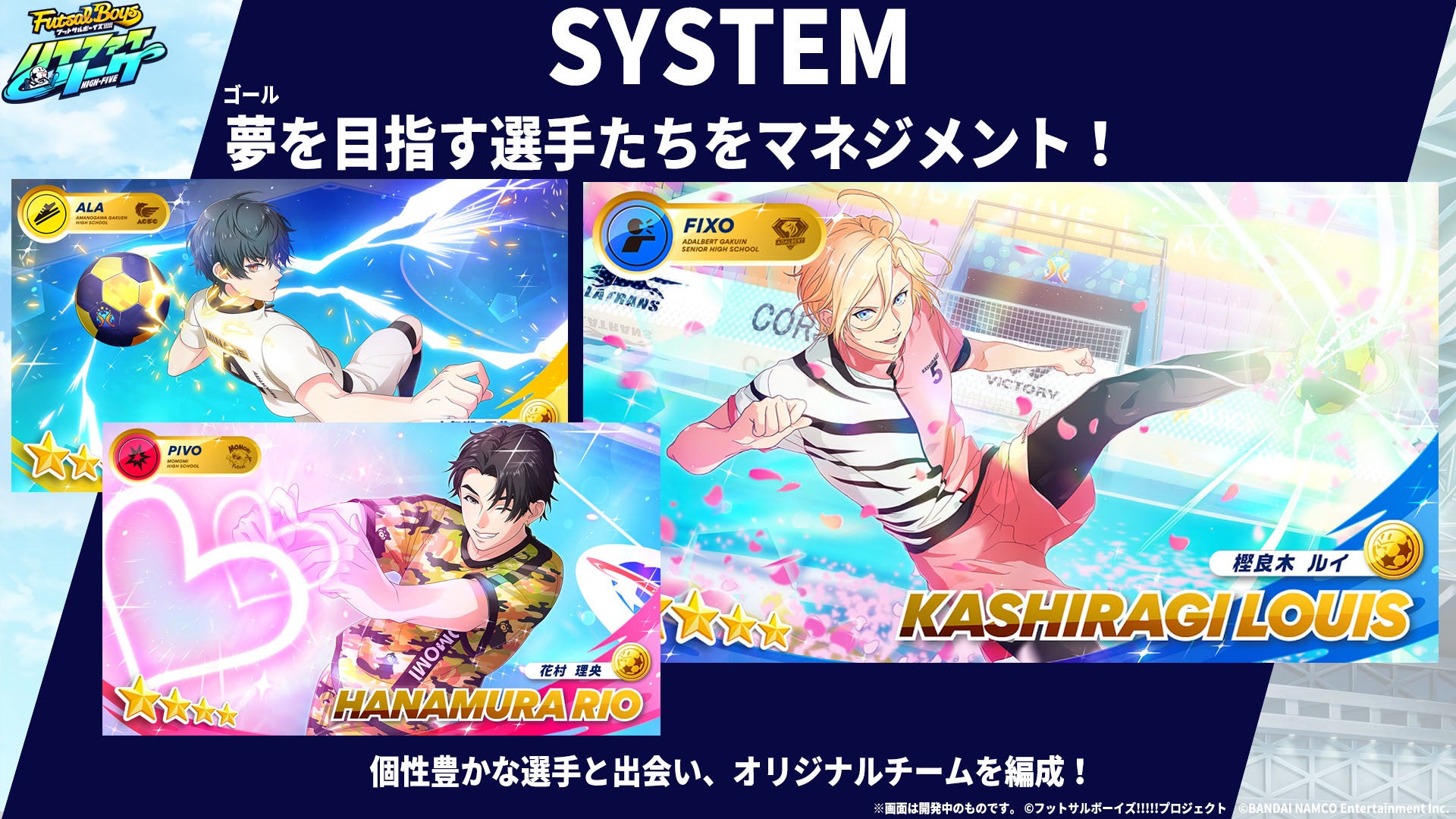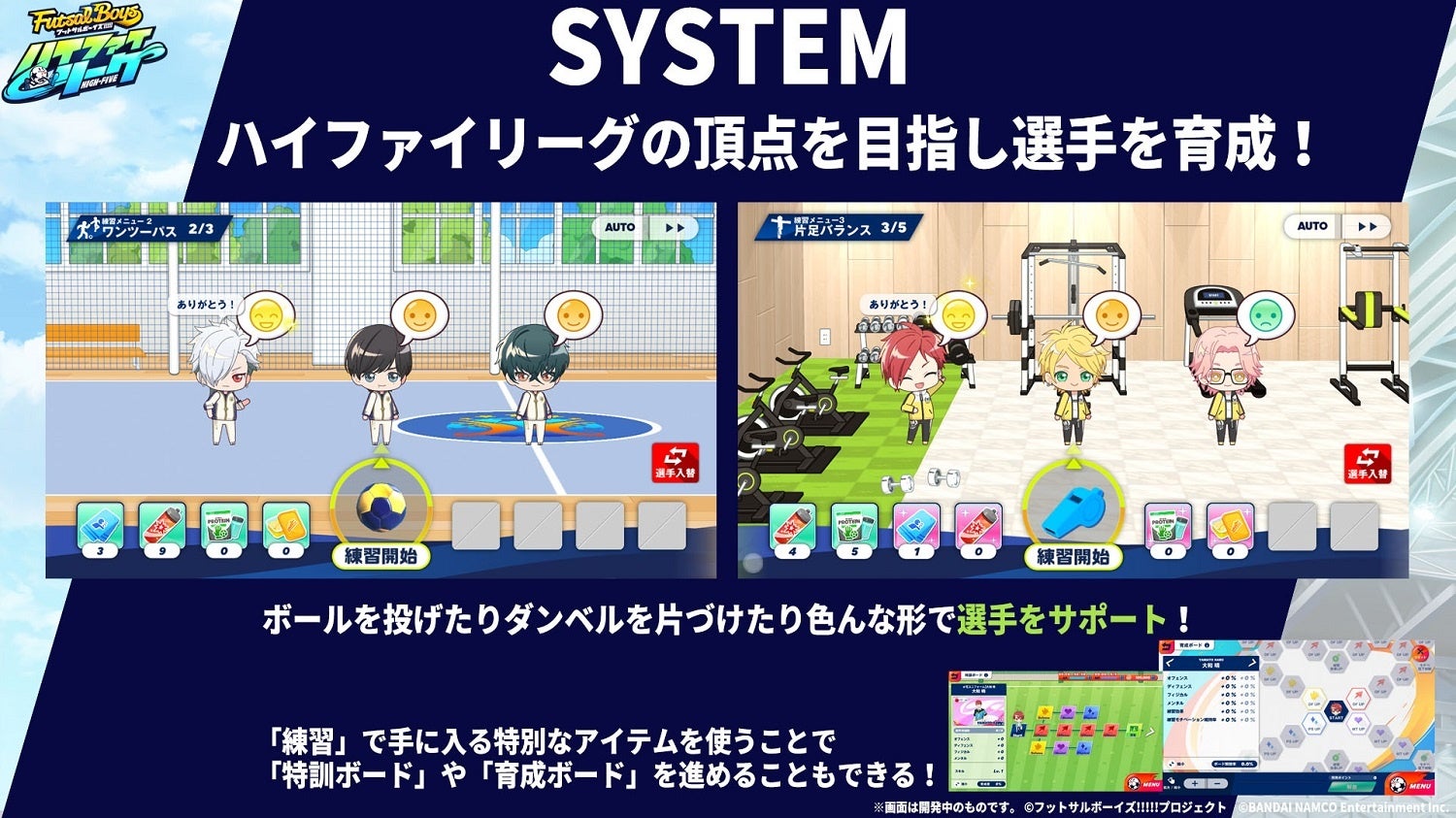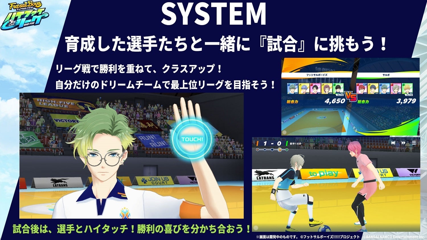 アプリゲーム “フットサルボーイズ!!!!! ハイファイリーグ”は、プレイヤーがマネージャーとなり、学校の垣根を超えた「ハイファイリーグ」に向けて選手たちを応援&育成し、彼らを勝利に導く”応援と絆が育む本気男子育成アプリ”