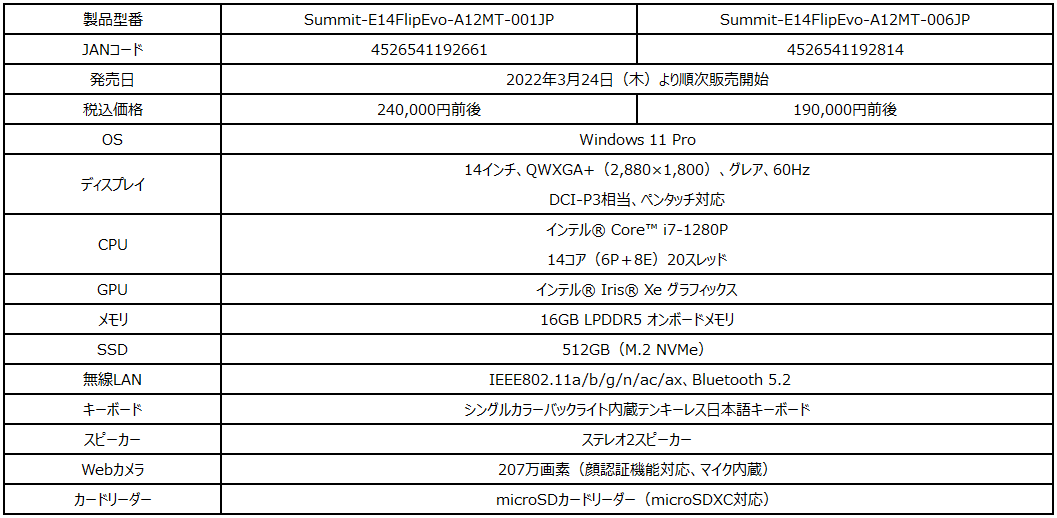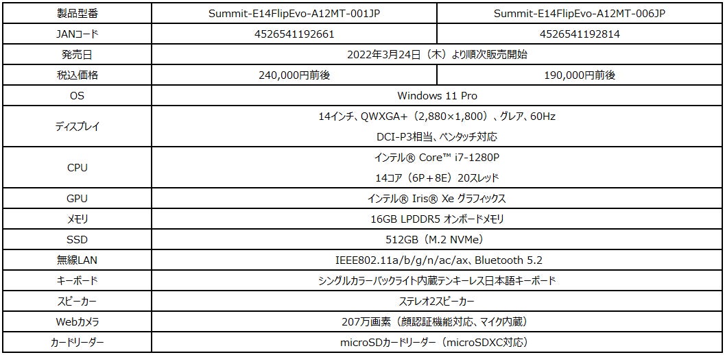 高解像度・広色域、360度回転可能なフリップディスプレイ搭載 14インチハイスペックビジネスノートPC『Summit E14 Flip Evo A12』発売