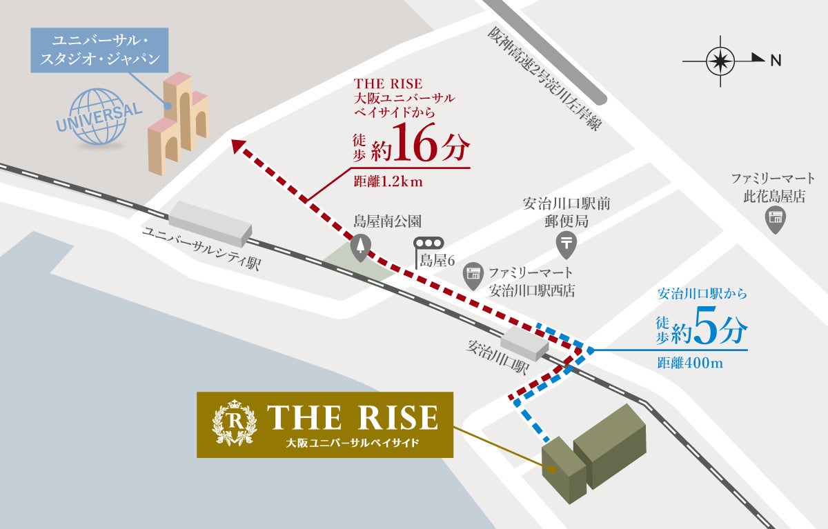 ユニバーサルシティ駅から1駅、JRゆめ咲線「安治川口駅」より徒歩約5分に位置。