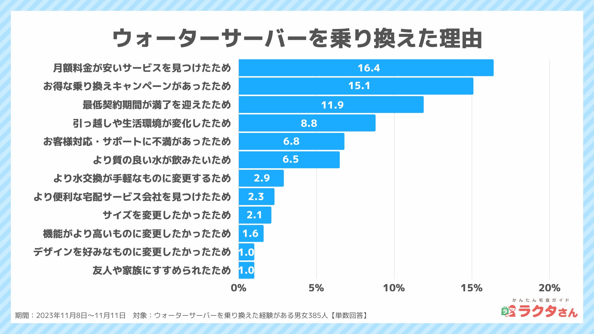 ウォーターサーバーを乗り換えた人に理由を尋ねると、最も多いのは「月額料金が安いサービスを見つけたから(16.4%)」、次いで「お得な乗り換えキャンペーンがあったから(15.1%)」、「最低契約期間が満了を迎えたから(11.9%)」でした。