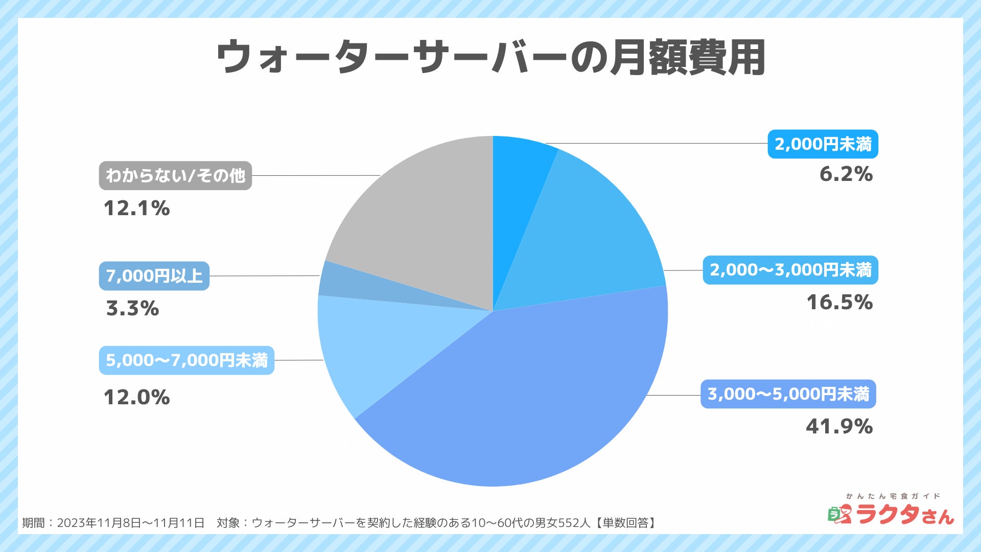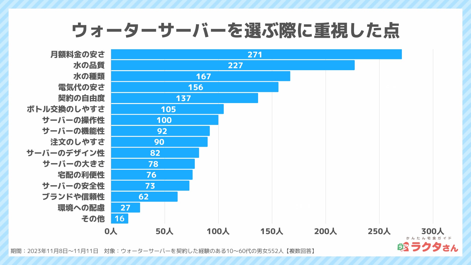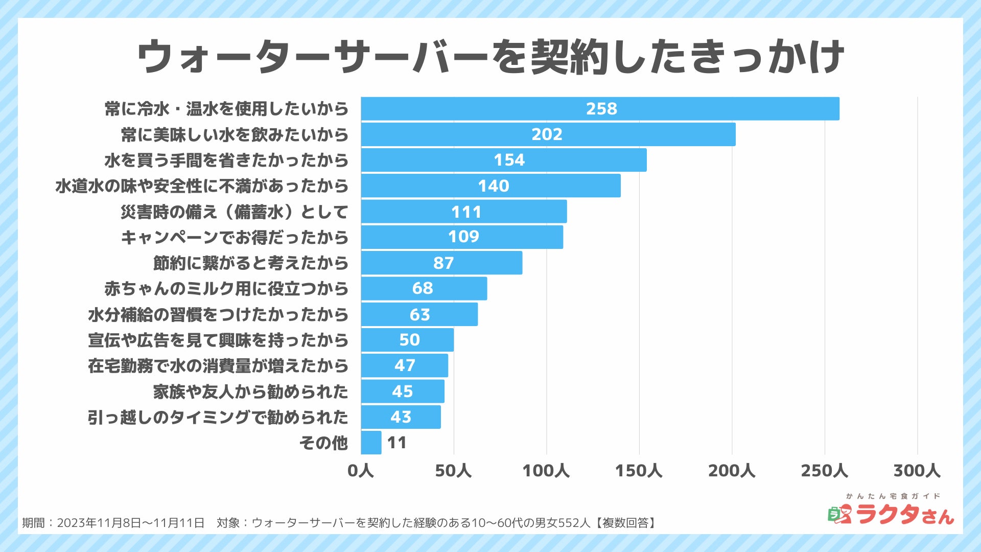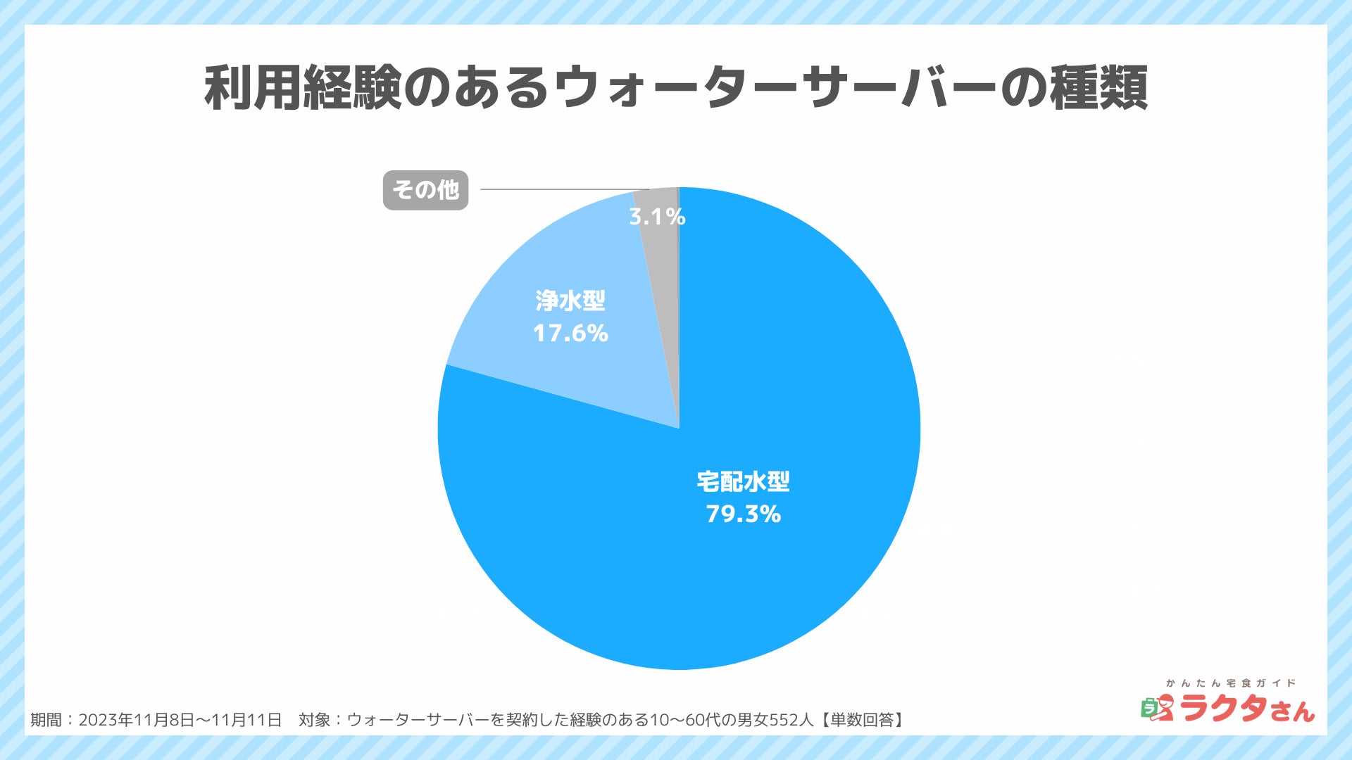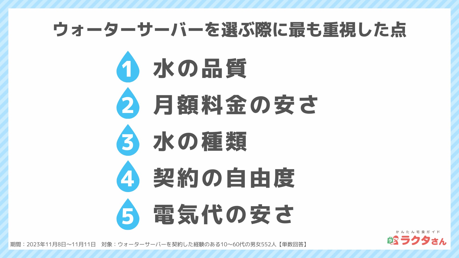 ナイル株式会社(本社:東京都品川区、 代表取締役社長:高橋飛翔、 以下ナイル)が運営する「かんたん宅食ガイド ラクタさん」にて、ウォーターサーバーを契約した経験のある男女552人を対象に、2023年11月8日〜11月11日の期間で、ウォーターサーバーの利用に関するアンケート調査を実施しました。