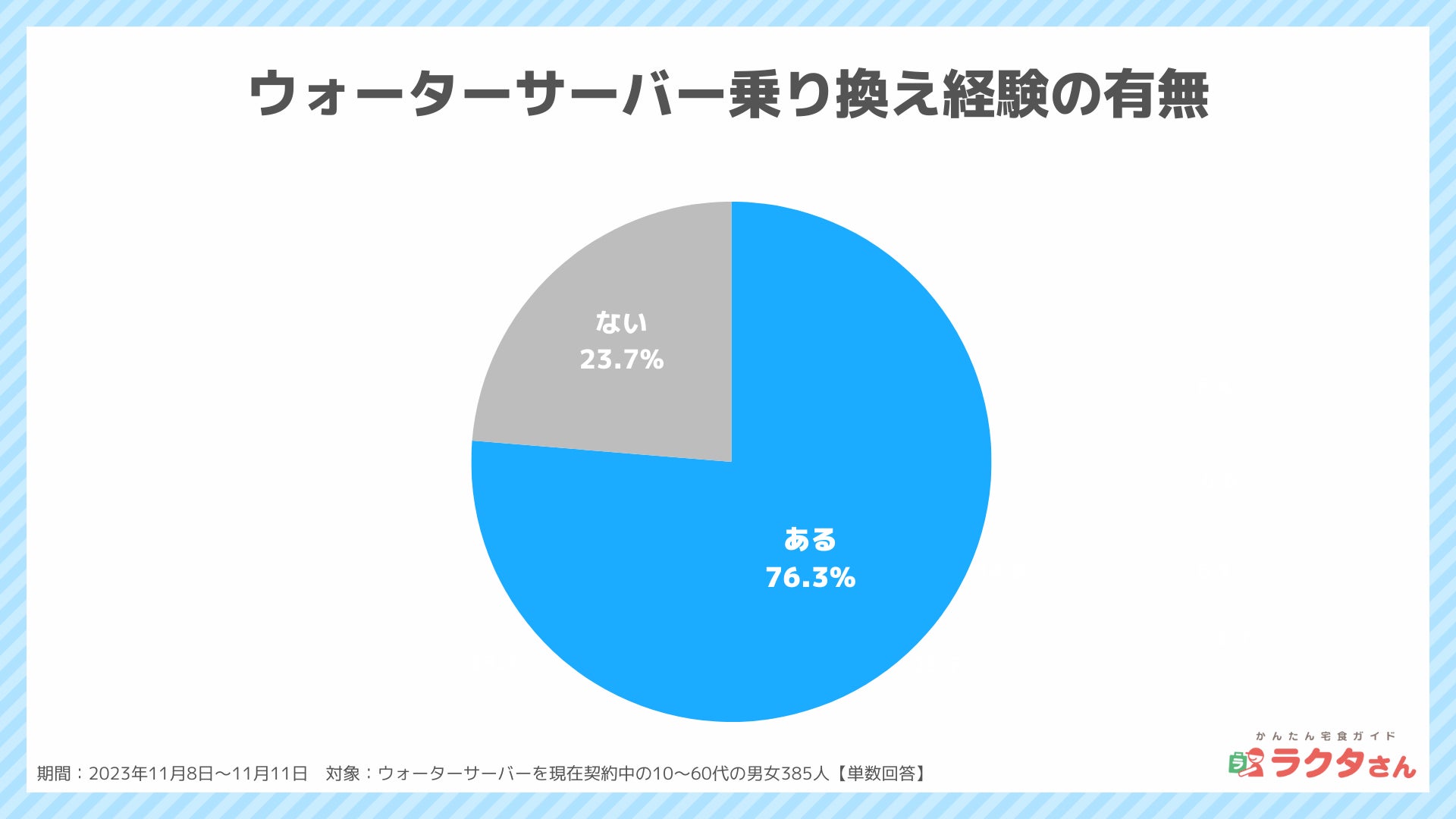 現在契約中の385人に、ウォーターサーバーの乗り換え経験を聞いた結果、「ある(76.3%)」、「ない(23.7%)」でした。