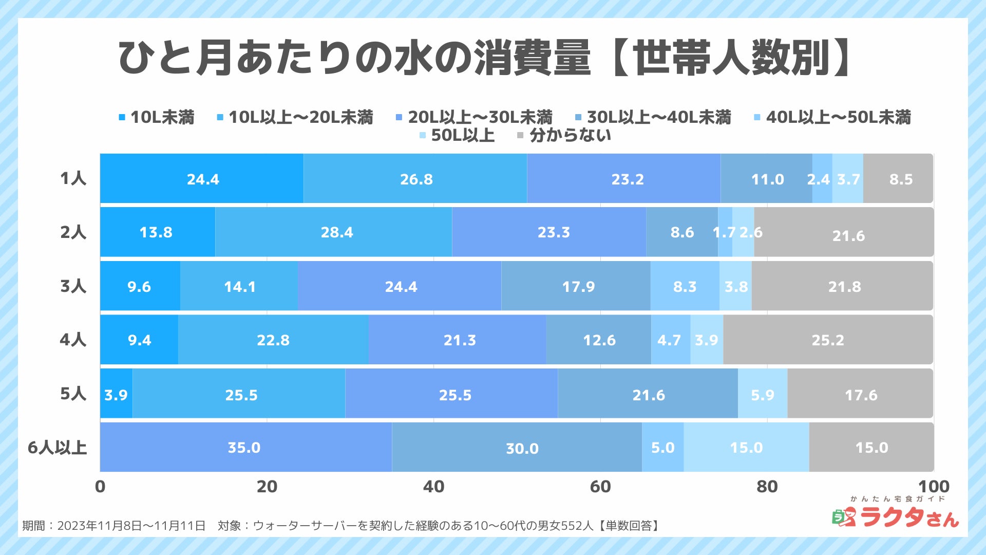 世帯人数別では、どの世帯でも、「10L~20L未満」もしくは「20L~30L未満」が最も多く、6人以上では、30L以上消費している割合が半数を超えています。