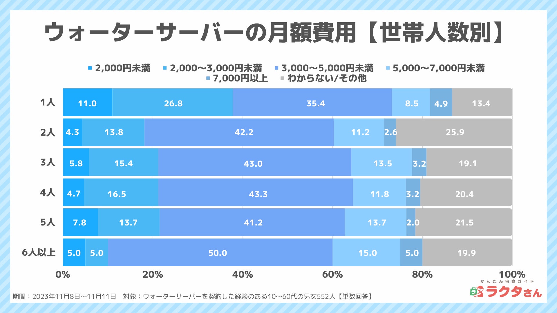 世帯構成人数別で見てみると、「3,000~5,000円未満」が最も多い結果となりました。1人暮らしの37.8%は、毎月のウォーターサーバー代が3,000円未満となっており、これは世帯人数が2人以上と比較して約2倍近くなっています。