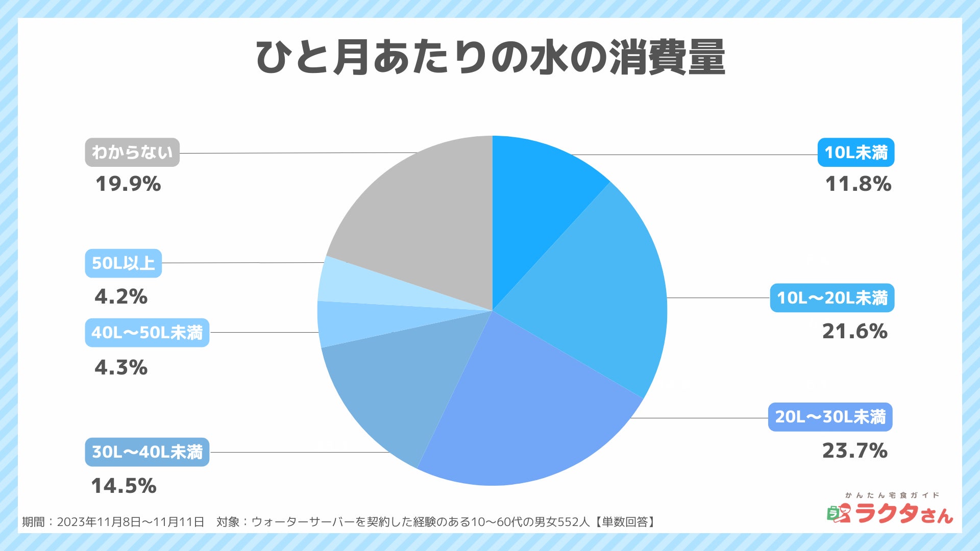 毎月の水の消費量を調査した結果、「20L~30L未満(23.7%)」が最も多く、次いで「10L~20L未満(21.6%)」、「30L~40L未満(14.5%)」でした。