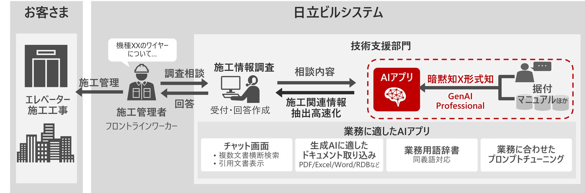 今回、エレベーター施工現場における管理者からの問い合わせ業務を革新するAIアプリを開発し、フロントラインワーカーの業務効率向上をめざす取り組みを推進しています。日立ビルシステムのエレベーター施工においては、毎月約100件、平均対応時間約30分/件の問い合わせが発生しており、専門知識を持つエンジニアが据付マニュアルをはじめとする関連ドキュメントを確認しながら対応するため、回答に時間を要し、業務効率の向上が大きな課題となっています。AIアプリの開発において、GenAI Professionalがエレベーター施工に関連するさまざまなドキュメントを技術支援部門のエンジニアの知見に基づいて生成AIに紐づけるとともに、回答精度の向上を支援しました。これにより、問い合わせ内容に対して約80%*7の精度で瞬時に関連情報を抽出して表示することができ、問い合わせ対応に掛かる時間と工数を削減し、エレベーター施工の作業効率自体も向上することが可能となります。