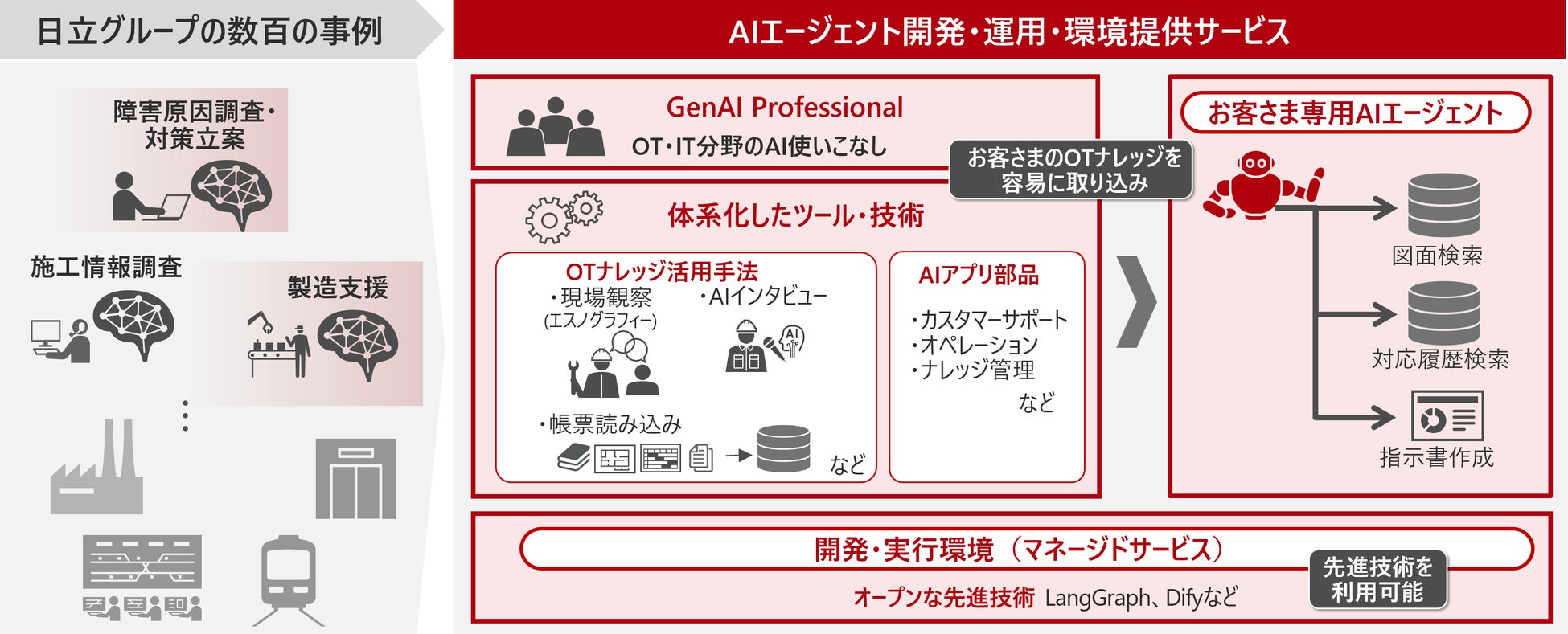 株式会社日立製作所(以下、日立)は、建設や輸送、電力、ガス、鉄道などの現場で働くフロントラインワーカーの人手不足の解消や知識継承などの課題解決に向け、熟練者のノウハウを取り込んだお客さま専用のAIエージェントを提供する「AIエージェント開発・運用・環境提供サービス」を3月31日より販売開始します。本サービスは、生成AIを活用した業務効率化やサービスの高度化など経営改革を推進するお客さまを伴走型で支援する生成AI活用プロフェッショナルサービスpowered by Lumada*1のメニューとして提供するものです。高度なAIスキルを有する日立のGenAI Professionalが、日立グループにおける数百の事例で獲得したOT*2ナレッジのAI活用スキルと体系化されたツールや技術を使いこなし、お客さまに伴走しながら、OTナレッジを活用したAIエージェントを迅速に開発・提供することで、フロントラインワーカーの業務効率向上を支援します。