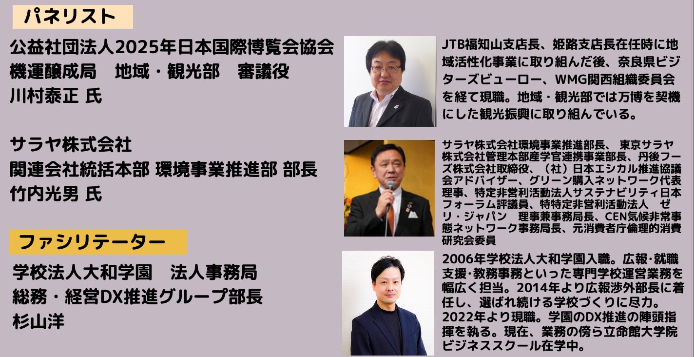 イベントでは学生と地域が一体となって「食」を通じて地域活性化を目指す取組を紹介し、大阪・関西万博に向けて地域を活性化すべく、特別ゲストを招いてのトークセッションを行います。(試食会の時間も設定し、大和学園が開発した地元食材を活用した新メニュー2品のお披露目会を兼ねます。)