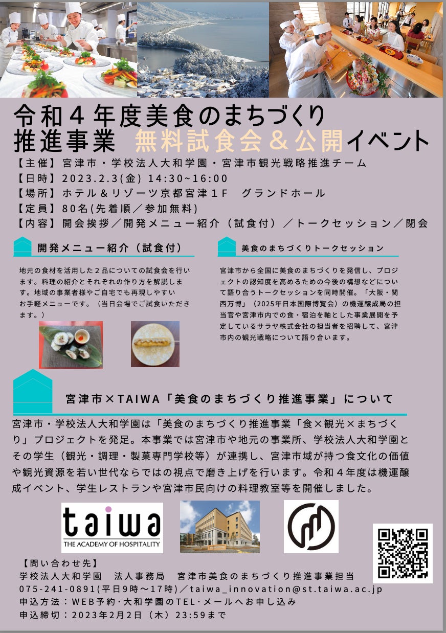 学校法人大和学園 京都調理師専門学校が2023年2月3日(金)に宮津市内(ホテル&リゾーツ京都宮津)にて無料試食会イベント開催!先着80名様無料で受付中。