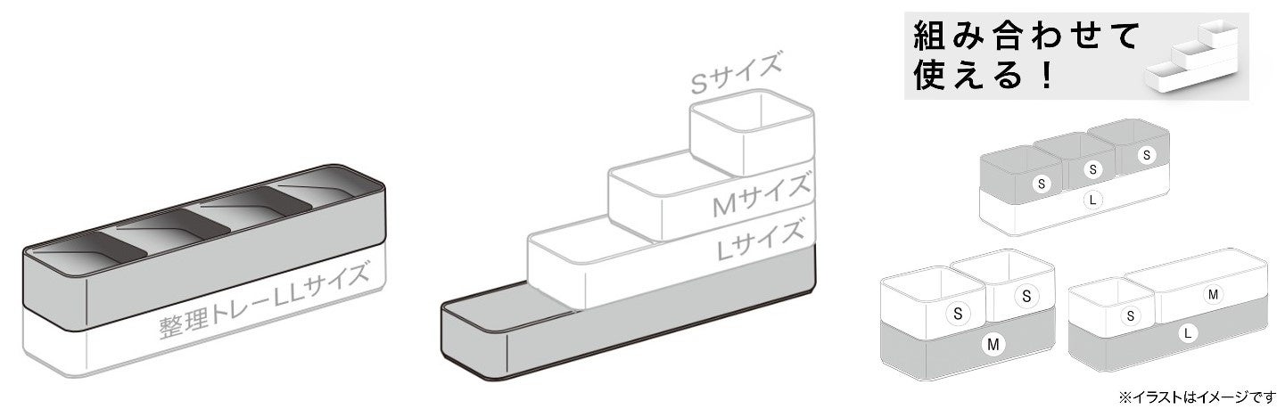 また、上記のカトラリートレーと同じサイズでぴったり重ねて使える「整理トレー NブランLL」も新発売しました。LLサイズは幅が34㎝あるので、菜箸などを入れるのに適したサイズです。「整理トレー Nブラン」シリーズのサイズ違い(S、M、Lサイズ)と組み合わせてお使いいただけます。