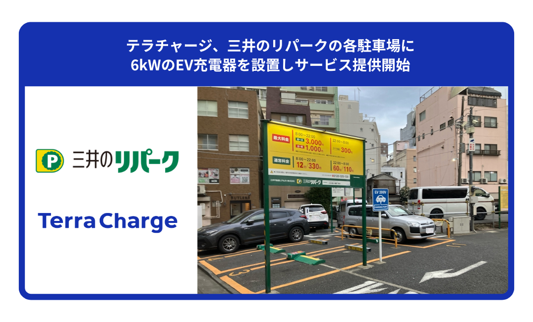 電気自動車(EV)向け充電サービス「Terra Charge(テラチャージ)」を展開するTerra Charge 株式会社(本社:東京都港区、代表取締役社長:徳重徹、以下、当社)は、三井不動産リアルティ株式会社(本社:東京都千代田区、代表取締役社長:児玉光博)が展開する「三井のリパーク」各駐車場への、EV(電気自動車)向け6kW出力の普通充電器が設置し、サービスを開始いたしました。