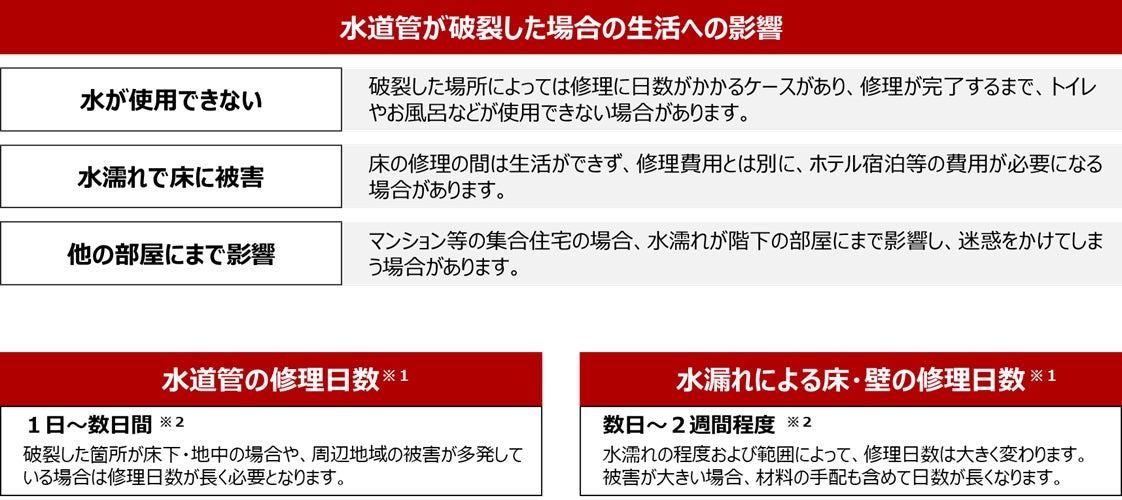 また、凍結による水道管の破裂は、建物への水濡れ被害を引き起こし、壁や床の修理が必要となるケースも多く見られます。水濡れによる被害は、特に年末年始の時期で多く見られ、日常生活においてお客さまがお困りになるケースも発生しています。
