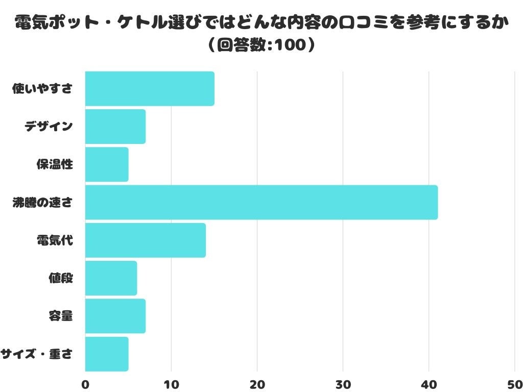 電気ポット・ケトルのどんな内容の口コミを参考にするかをアンケートにて調査したところ、1位は「沸騰の速さ」 でした。