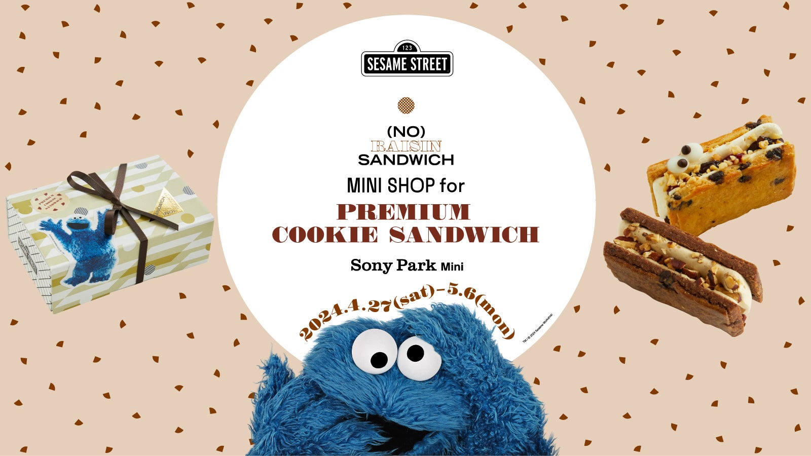 Sony Park Mini(ソニーパークミニ)は、フードエッセイスト・平野紗季子がプロデュースする洋菓子ブランド「ノー・レーズン・サンドイッチ((NO) RAISIN SANDWICH)」と、「セサミストリート」の人気キャラクター「クッキーモンスター」との夢のコラボレーションによるPOP-UP ショップ「(NO) RAISIN SANDWICH MINI SHOP for PREMIUM COOKIE SANDWICH」を、4月27日(土)~5月6日(月・祝)の10日間限定でオープン。今回のコラボレーションのために考案された「プレミアムクッキーサンドイッチ for クッキーモンスターズ」や、Tシャツ、缶バッジなどのコラボレーショングッズを販売します。