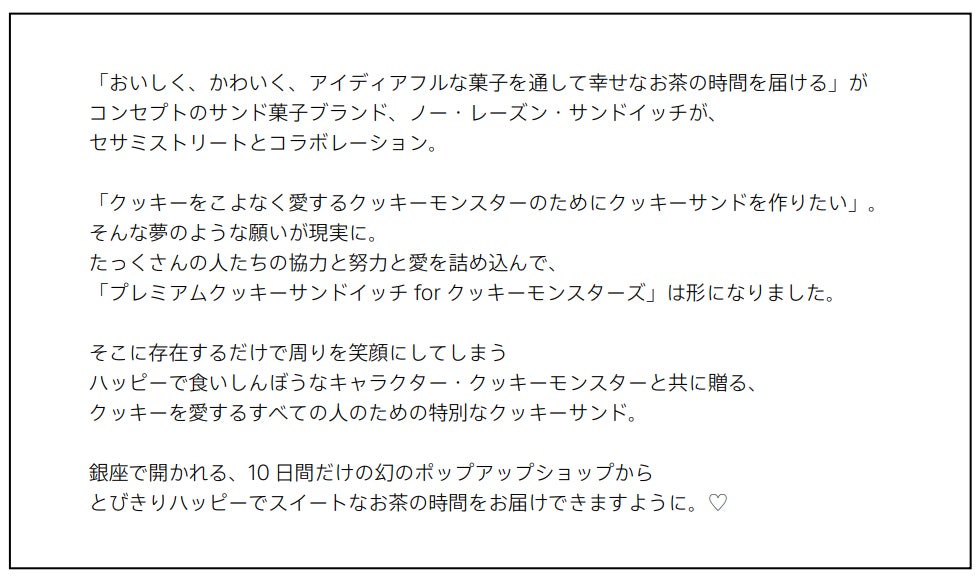 フードエッセイスト・平野紗季子が手掛ける洋菓子ブランド「ノー・レーズン・サンドイッチ」とセサミストリート「クッキーモンスター」との夢のコラボによるPOP-UPショップ