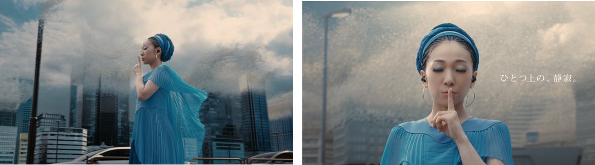 新CMでは「音楽のために作られたノイキャン」を表現するため、騒がしい都会の中を歩くMISIAが『WF-1000X M5』をワンタップしてノイキャンモードに切り替えることで自分以外の全てが消え、音楽だけに没入できる「ひとつ上の、静寂」空間を演出しています。「ひとつ上の、静寂」だからこそ、MISIAの圧巻の歌声をさらに際立って届けられ、平和への願いが込められた「希望のうた」のメッセージがより鮮明に感じられます。