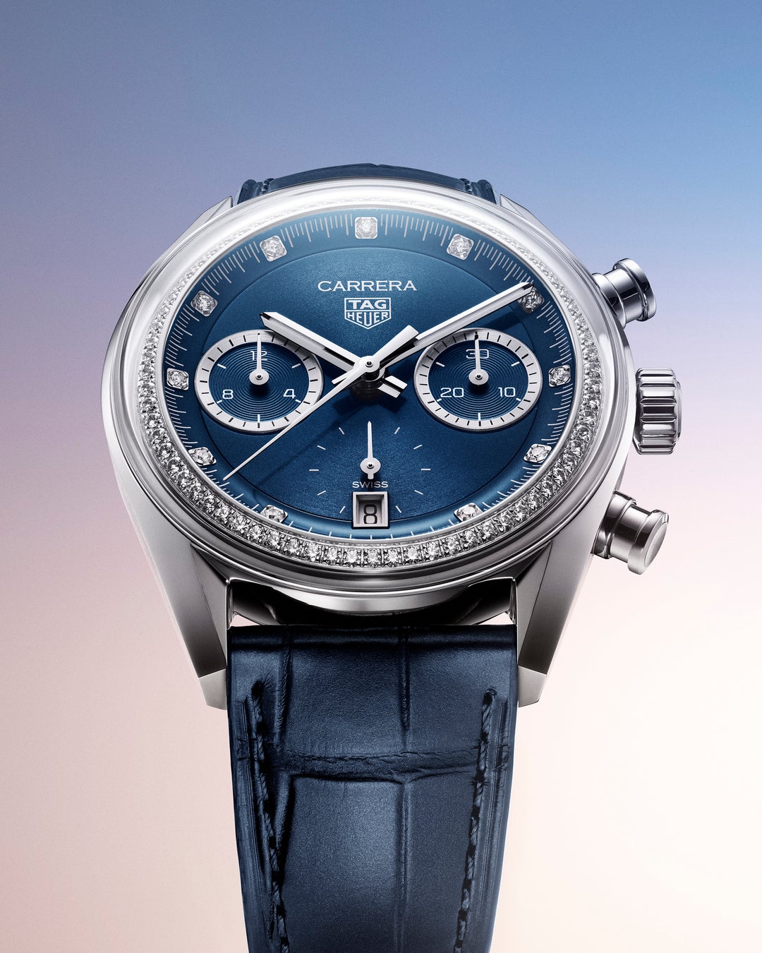新作「タグ・ホイヤー カレラ クロノグラフ」は、上品な2色のカラーバリエーションで登場。そのひとつが「タグ・ホイヤー カレラ」のシグネチャーカラーであるブルー、もうひとつが繊細なパウダリーピンクです。この2色が、エレガントな美しさと汎用性の高いタイムレスな魅力を映し出す、統一感のあるストーリーをコレクションにもたらしています。