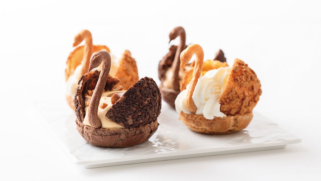 スワンシューには生クリームとカスタード、ブラックスワンシューにはチョコカスタードが詰まっています。給食の定番「揚げパン」をふわもち食感のパン生地に仕上げ、きな粉、抹茶、ココアの3種をご用意。ほんのり甘い香りが食欲をそそります。
