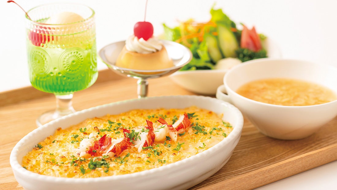 ■昔ながらの洋食屋さんをイメージした限定セット。特選素材を使ったクラシカルな料理を、メロンクリームソーダとともにお召し上がりください。