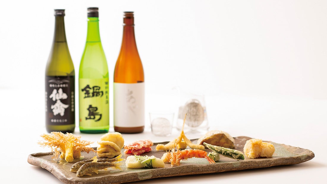 鱧や稚鮎などの旬の魚や、茄子やとうもろこしなどの夏野菜を天ぷらに。揚げたての食感や香りをより一層引き立てる日本酒もご用意しております。