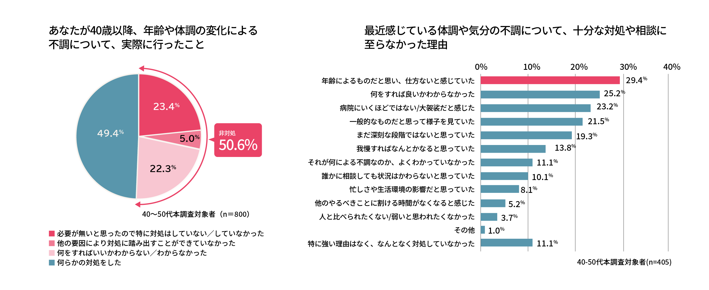 40~50代の女性において、自身の不調に気づいていても、そのうち約半数(50.6%)が「特に対処していない」または「何をすればいいかわからない」と行動を起こせていない実態が判明しました。