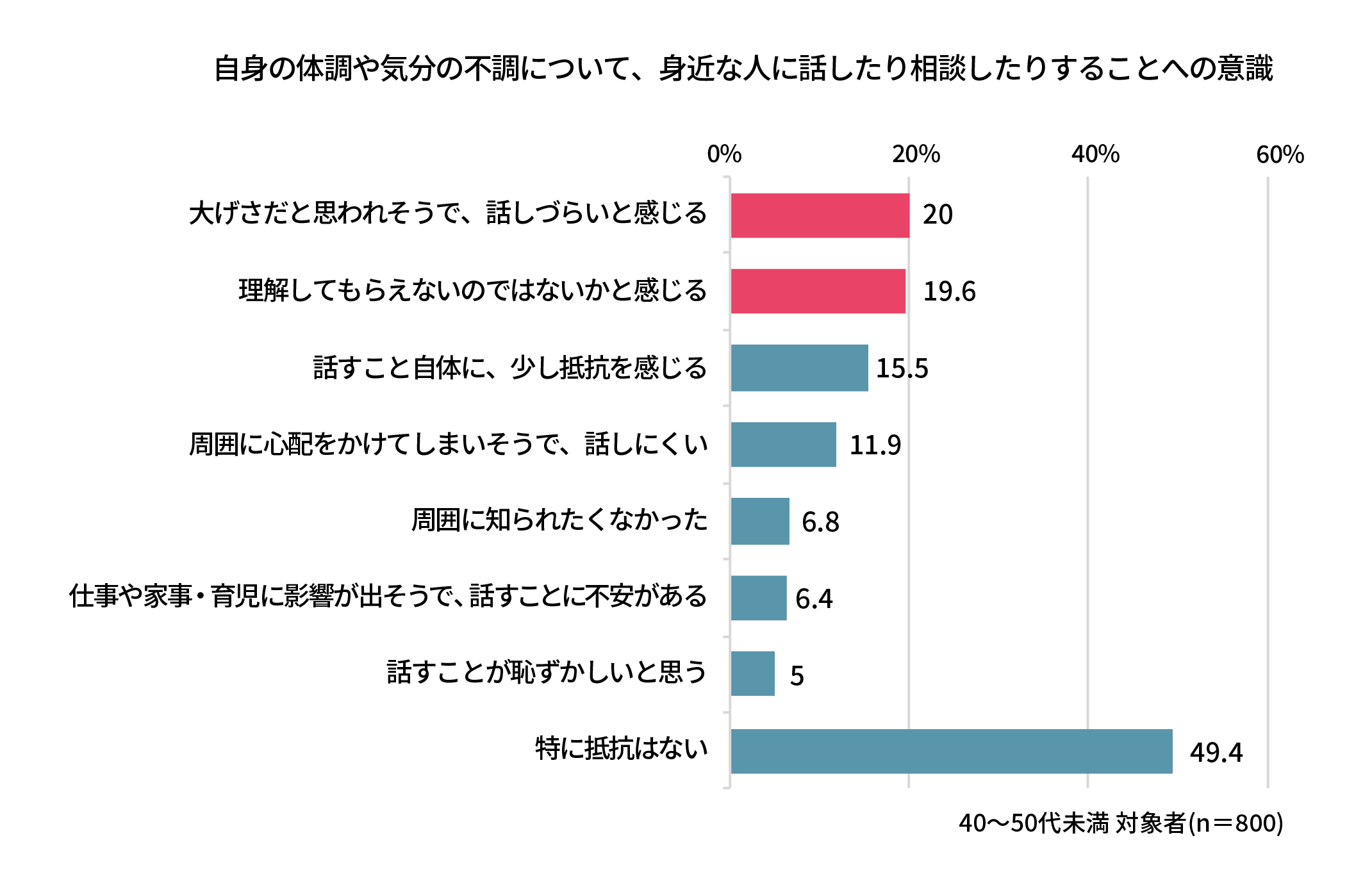 不調を周囲に相談することに対し、大げさだと思われそうで話しづらい」(20.0%)や「理解してもらえないのではないか」(19.6%)という周囲の目を不安視