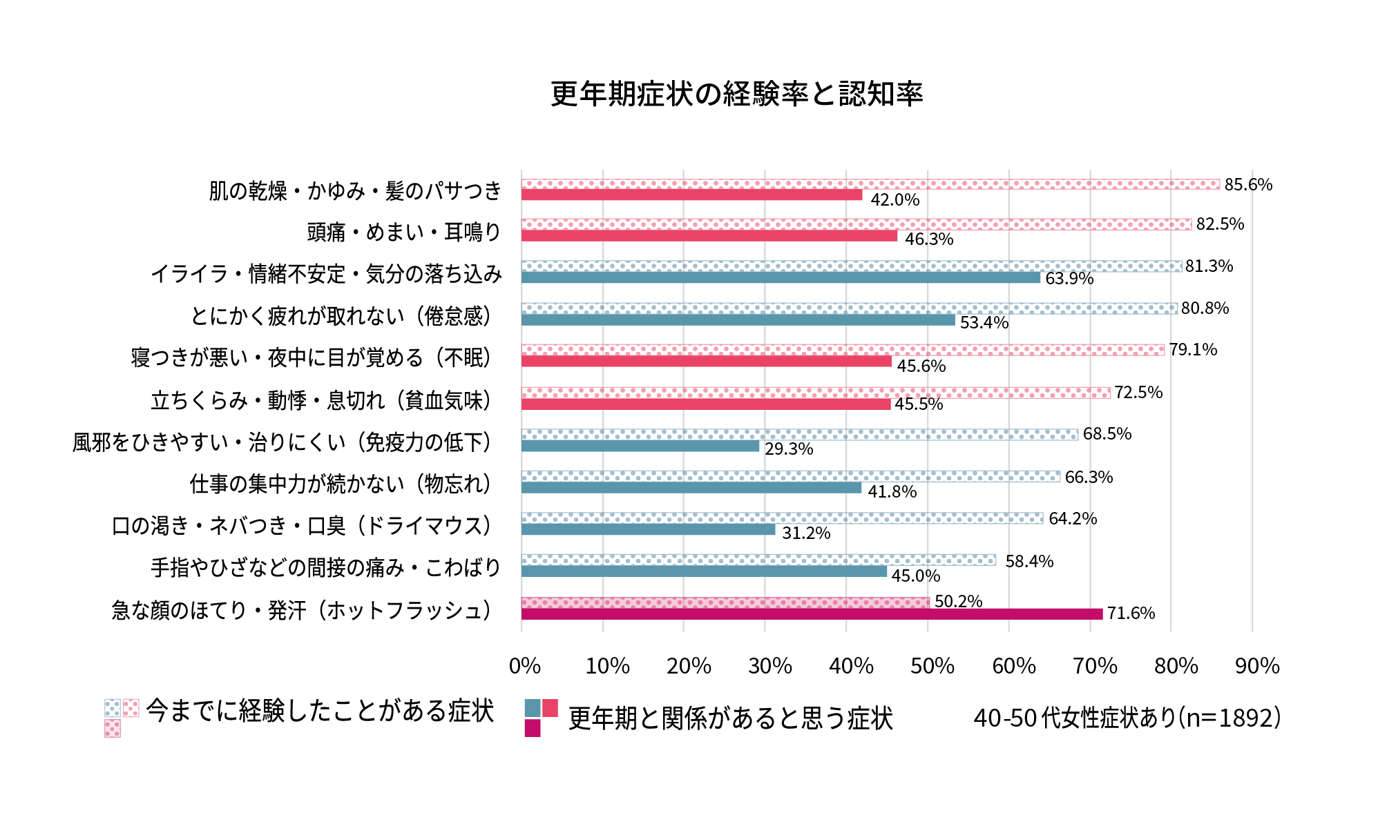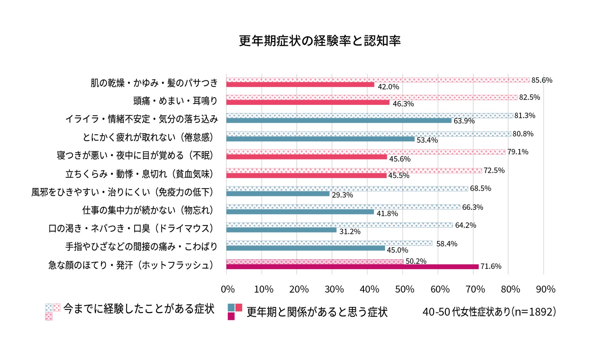 Ⅰ. 40〜50代女性の7割が経験する「肌の乾燥・頭痛・不眠」、半数以上が更年期関連不調と認知されず。更年期のサインは身近な不調ほど見逃される