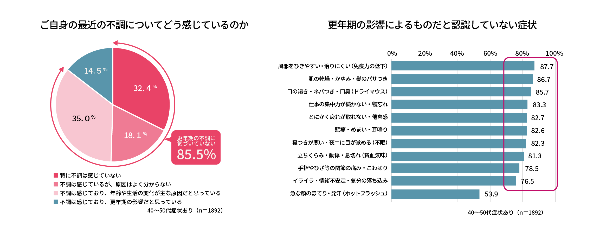 忙しさや「これくらい大丈夫」という思い込みによって見落としがちな身体の不調に対し、『隠れ更年期』かもしれないと自身の状態を見つめ直すことが、自らの不調への気づきにつながり、セルフケアへの第一歩につながることが示唆されます。