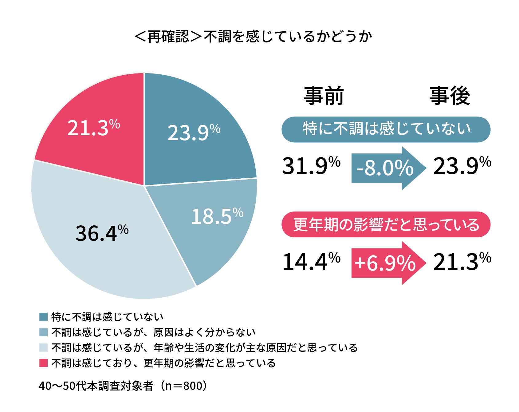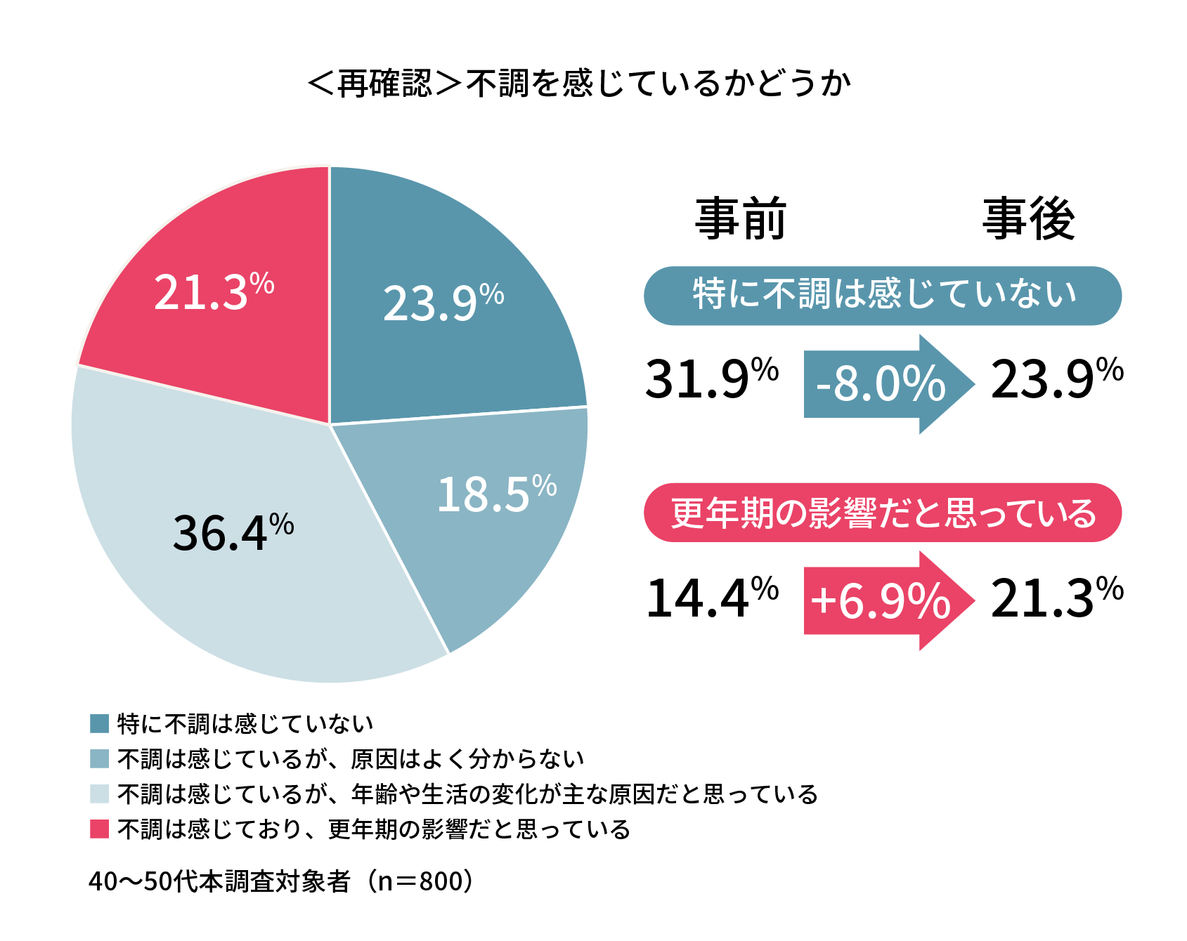 調査の事前・事後で同一の質問を用いて、自身の体調に対する認識を比較したところ、「特に不調は感じていない」と回答した割合は、調査前の31.9%から調査後には23.9%へと8.0ポイント減少しました。調査を通じて自身の不調と向き合った結果、これまで見過ごしていた自身の不調に気づく変化が見られました。加えて、自身の不調が「更年期の影響だ」と気づく人の割合も調査の事前事後で6.9ポイント増加しました。