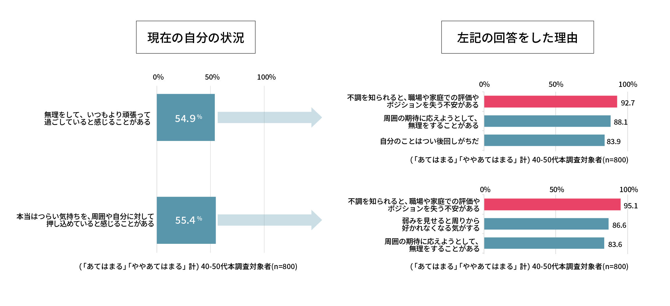 現在の自身の状況について、半数以上の女性は「無理をして、いつもより頑張って過ごしていると感じることがある」(54.9%)、「本当はつらい気持ちを、周囲や自分に対して押し込めていると感じることがある」(55.4%)、と回答しました。その理由の第一位に共通して挙げられた回答は、「不調を知られると、仕事や家庭での評価やポジションを失う不安がある」(「無理をして、いつもより頑張って過ごしていると感じることがある」:92.7%、「本当はつらい気持ちを、周囲や自分に対して押し込めていると感じることがある」95.1%)となっており、90%以上の女性が仕事や家庭に不調を知られることへの影響を不安視していることが明らかになりました。