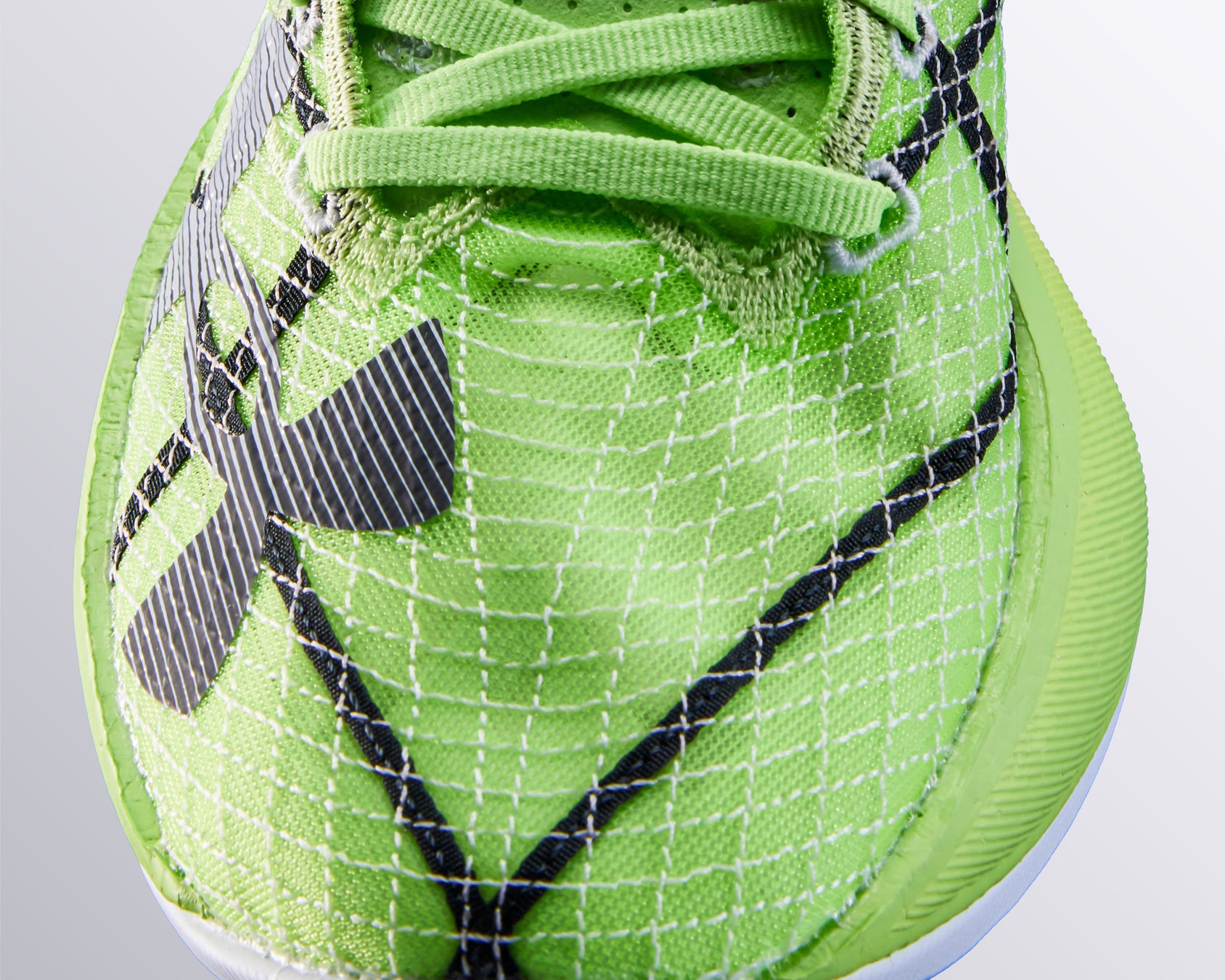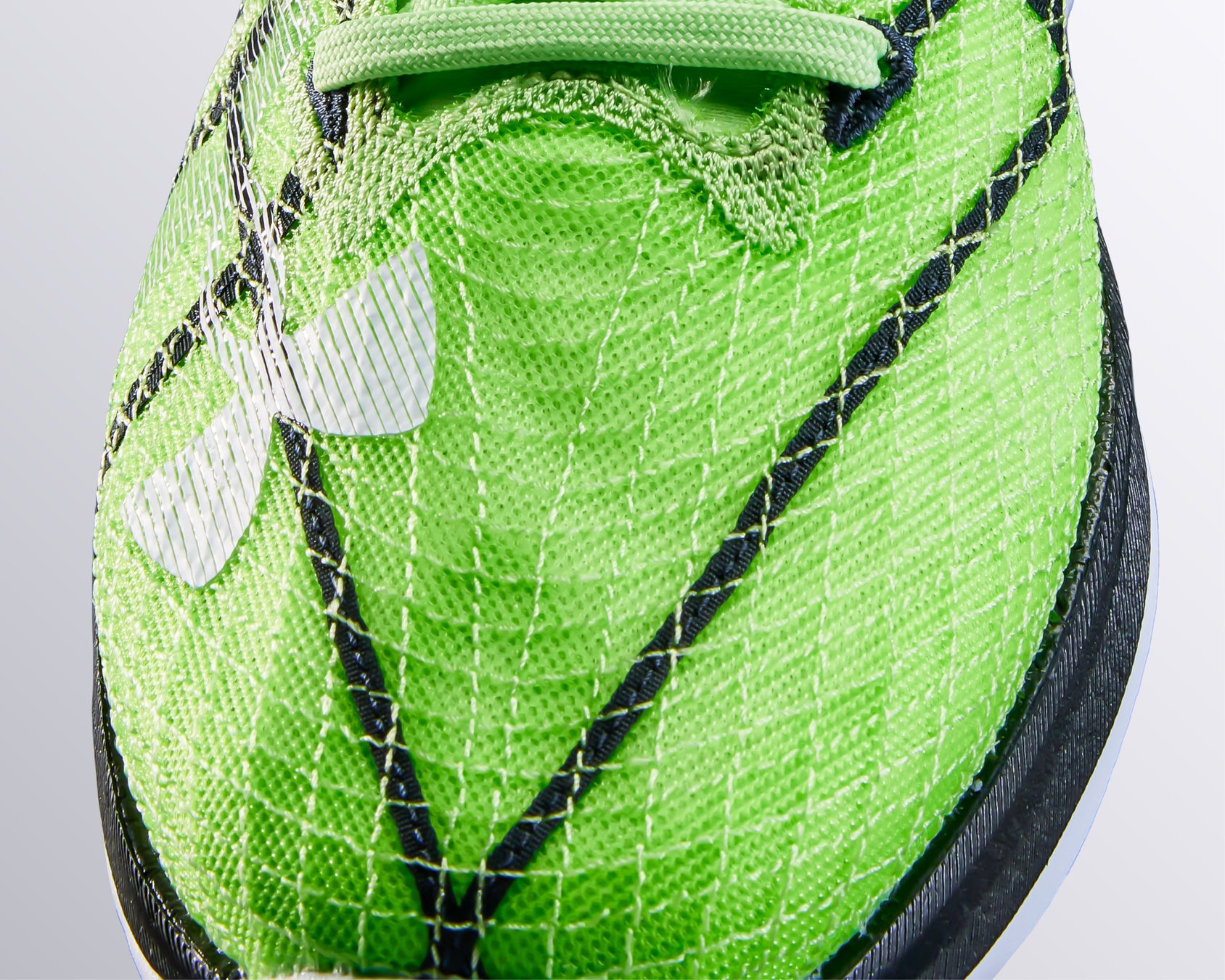 さらに、アパレルで培ったアッパーの快適なフィット感もさらに進化。テープと刺繍が施された「ワープアッパー」がランナーの足をソールにしっかり固定、足のブレを軽減し、最後まで安定した力強い走りを支えます。
