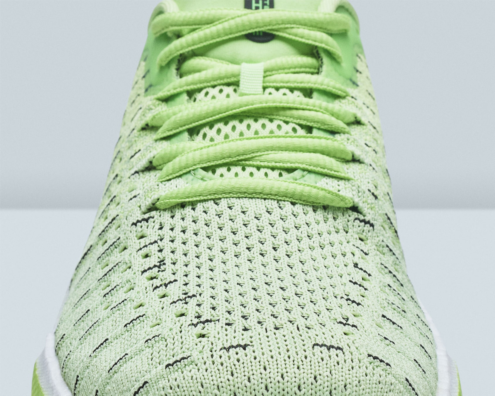 通気性と柔軟性に優れたフラットニットアッパーが足の動きに合わせ、適切にフィットする。