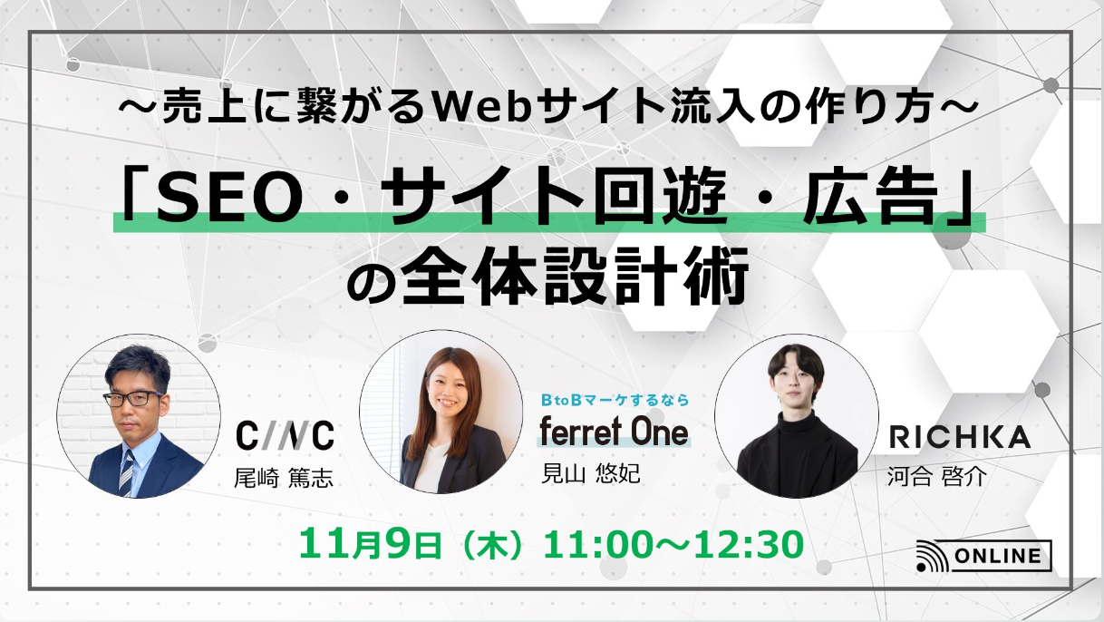 このセミナーでは、「SEO・サイト回遊・広告」の3つの視点から、Web流入を効果的に売上に繋げる方法を具体的に解説します。