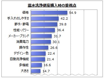 温水洗浄便座購入時の重視点は、「価格」(54.9%)の他、「手入れのしやすさ」「節水・節電」「性能・パワー」が各4割で上位にあがっています。「性能・パワー」「操作性」「節水・節電」「手入れのしやすさ」「自動洗浄機能」は、高年代層、特に女性50代以上で比率が高い傾向です。「手入れのしやすさ」は女性の比率が高く、女性40代以上では5~6割となっています。