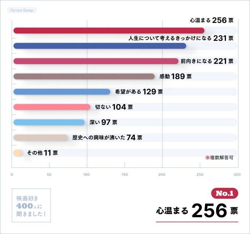 続いて、「人生について考えるきっかけになる」、「前向きになる」など。Filmarksのユーザーレビューでも、「真っ直ぐに生きるフォレストを見て、心が洗われた気分になった。一生懸命な素直さは、周りを幸せにするんだなと思った。」「映画のそこかしこにある名言が本当に美しく、心に刻んで生きていきたい。」など、フォレストの純粋さや、生き方に「温かさ」や「前向きさ」を感じたユーザーが多くいました。