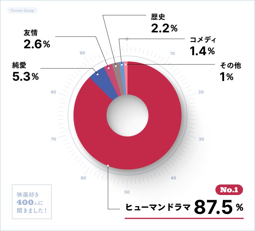 フォレストと周りの人々との関係を通じて描かれる、愛や成長に「ヒューマンドラマ」だと感じたユーザーが多いことがわかりました。以下、「純愛」が5.3%、友情が2.6%、歴史が2.2%、コメディが1.4%という結果になりました。