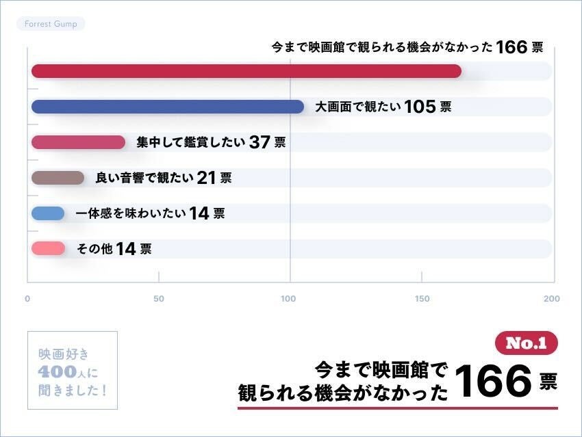 映画館で鑑賞したい理由は「今まで映画館で観られる機会がなかった」が166票で第1位となりました。レンタルや配信での鑑賞が多く、映画館では観たことのないユーザーが多くいたようです。また、「大画面で観たい」「集中して鑑賞したい」など、映画館ならではの鑑賞体験を楽しみたいユーザーも多いことがわかりました。